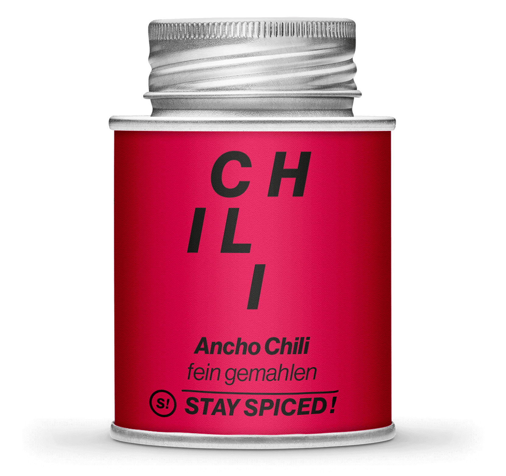 Herkunft Poblano ist eine Zuchtform der Paprika-Art Capsicum annuum, welche vor allem in Mexiko angebaut wird. Allgemeines Die Namen Ancho und Mulato sind teilweise synonym, sie bezeichnen jedoch oft andere Reifegrade oder die getrockneten Früchte. Der Ancho Chili ist rot wohingegen der Mulato braun ist. Zusammen mit den Sorten Jalapeño und Pasilla sind sie ein wichtiger Faktor der mexikanischen Küche. Der Ancho Chili ist einer der milderen Sorte von Chilies und schmeckt leicht nach getrockneten Pflaumen oder nach Tabak. Verwendung Man verwendet ihn traditionell für mexikanische Soßen (Moles). Generell gehört er bei der mexikanischen Küche zur Grundausstattung. Verschiedenste Soßen und Gerichte können mit Ancho Chili fein abgeschmeckt werden. Schärfegrad (1-10): 2-3 1.000-2.000 Scoville