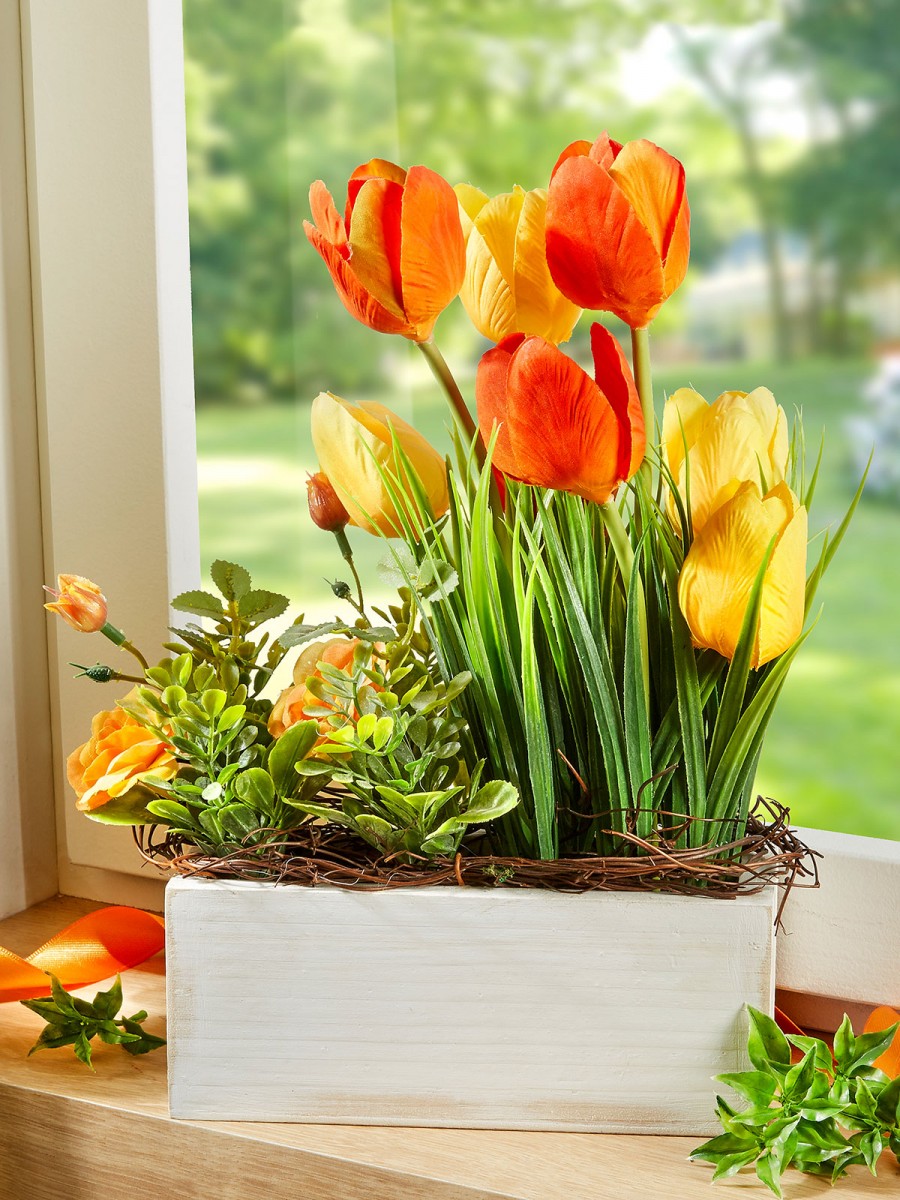 Dieser Anblick stimmt fröhlich Mit den wundervoll bunten Farben ist dieses Tulpen- und Röschengesteck im Holzkistchen im Frühjahr einfach ein Muss. Aus Kunststoff, Holz und Blüten aus textilem Material. Höhe: ca. 29 cm, Kasten: ca. 17 x 7 x 7 cm.