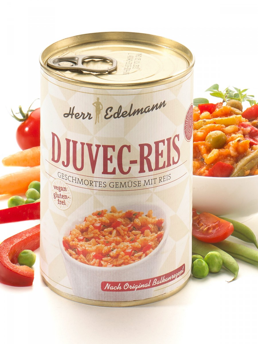 Der Balkanklassiker aus Reis und geschmortem Gemüse ist frisch verarbeitet, fein abgeschmeckt und verzehrfertig in einer praktischen Dosengröße für eine Portion. Für „Herr Edelmann“ Djuvec-Reis reifen die länglichen Kapija-Paprika, Tomaten, Auberginen, Zwiebeln, Karotten, Erbsen und grüne Bohnen im mediterranen Klima des Balkans. Genießen Sie ihn als Beilage oder als vollwertige, schnelle Mahlzeit. Ohne Geschmacksverstärker, vegan, gluten- und laktosefrei. 400 g.