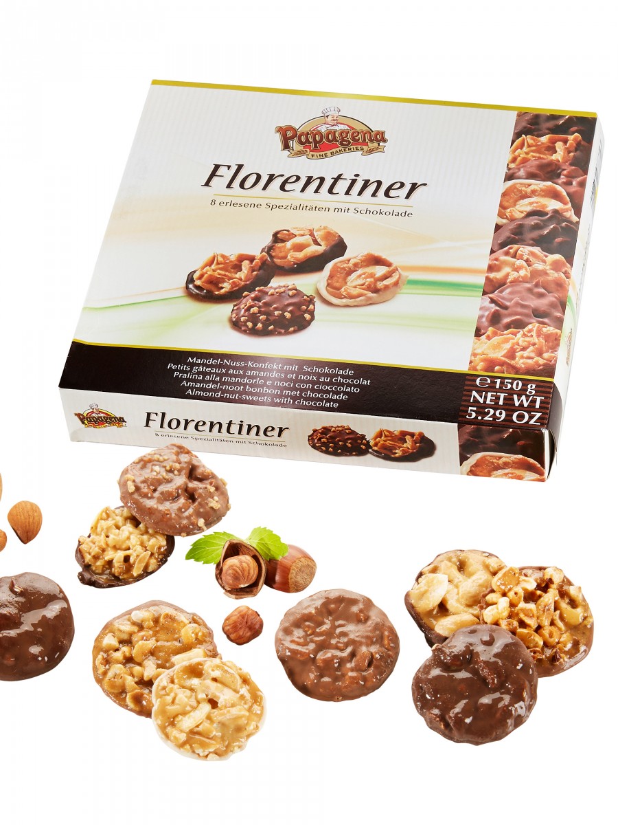 Mmmh Da läuft einem das Wasser im Mund zusammen. Gebäcktaler aus karamellisierten, gehobelten Haselnüssen und Mandeln mit einem Boden aus edelherber Zartbitter-, Vollmilch- und weißer Schokolade. Das knackig-kernige Gebäck stammt ursprünglich aus Florenz und verleiht Ihrer Kaffeetafel das „gewisse Etwas“. 150 g.