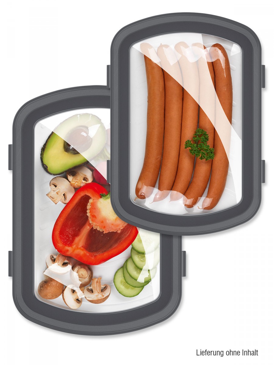Das clevere Tablett-Frischhaltesystem ist die Revolution für die Aufbewahrung von Lebensmitteln in Scheiben oder von geringer Höhe. Schluss mit offenen Verpackungen, die Lebensmittel vertrocknen lassen. Ade Aluminium- und Frischhaltefolie. Das clevere Frischhaltesystem spannt einen sehr elastischen Silikondeckel über die Nahrungsmittel und verhindert jeden Luftaustausch. Einfacher Verschluss, feste Verriegelung und auslaufsicher. Die Schalen wandern direkt aus dem Kühlschrank auf Ihren Tisch und anschließend in die Spülmaschine. Platzsparend stapelbar. Sie reduzieren Müll, sparen Geld für Verpackungen und verlängern die Haltbarkeit Ihrer Nahrungsmittel. Mikrowellen-, spülmaschinen- und gefriergeeignet. Das Tablett ohne Deckel ist hervorragend als Servierplatte geeignet. BPA frei. Ca. 31…