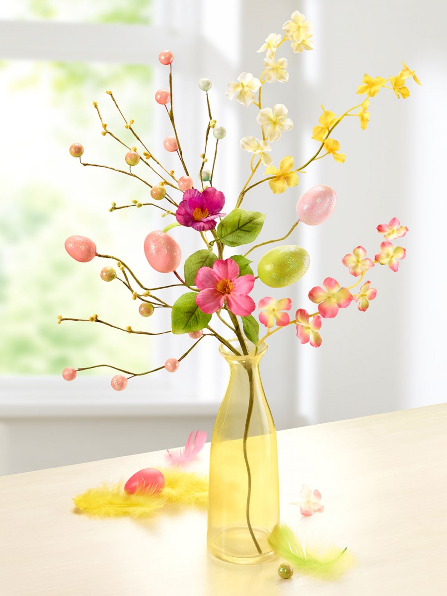 Bei Ihnen soll auch der Frühling einziehen? Dann bestellen Sie diesen sehr naturnah gearbeiteten Textil-Blütenzweig mit Beeren und Glitzer-Eiern in Pastellfarben Werden Sie kreativ und dekorieren Sie den frischen Zweig ganz nach Ihrem Geschmack. Die zarten Blüten blühen das ganze Jahr Höhe: ca. 70 cm.