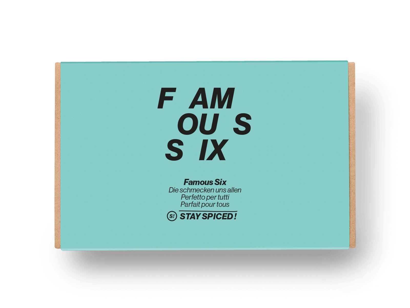 Die STAY SPICED ! Box mit den Famous Six Gewürzen der Manufaktur STAY SPICED ! Fans lieben sie. Künftige STAY SPICED ! Fans wollen sie. Und Gewürzliebhaber aller Art brauchen sie. Die Rede ist von der Topseller STAY SPICED ! Gewürzbox mit 6 beliebten Gewürzklassikern aus der Gewürzmanufaktur. Mit von der Genuss-Partie sind vom Allrounder über die Pfefferspezialität bis hin zum mediterranen Must-have verschiedenste Köstlichkeiten, die den Gourmet-Alltag ein Stück würziger machen. Und aus S ! Neuankömmlingen zukünftige STAY SPICED ! Allstars macht. Diese 6 STAY SPICED ! Topseller findest du in der Famous Six Gewürzbox: • Umami Gewürzzubereitung Eines für Alles! Das Umami Gewürz von STAY SPICED ! ist ein absolutes Allround-Talent beim Würzen. Ob Salate, Suppen, Saucen, Eintöpfe, Dips, Fleisch oder Fisch – die Gewürzkombination mit Zutaten wie Zwiebeln, Tomatenpulver, Meersalz und Estragon sorgt überall für einen „runden“ Geschmack. • Schwarzes Gold Drei-Pfeffermischung Diese erlesene Pfeffermischung ist DER Pfeffer-Evergreen aus unserer Salzburger Gewürzmanufaktur! STAY SPICED ! hat in dieser Komposition drei erlesene schwarze Pfeffersorten zum „Schwarzen Gold“ vereint: ?Indischen Tellicherry-Pfeffer, malaysischen Cubebenpfeffer und den bengalischen Langschwanzpfeffer aus Indonesien – der erste Pfeffer, der über die Römer nach Europa gelangte. • Bruschetta grüne Olive Dip & Gewürzmischung Einfach genial, unser Bruschetta grüne Olive! Perfekt zum Würzen von Marinaden und zum Anrühren von Dips. Für klassisches Bruschetta werden einfach 1 Teil warmes Wasser, 1 Teil Olivenöl? und 1 Teil STAY SPICED ! Bruschetta Gewürzmischung? zu gleichem Mengenverhältnis vermengt und etwas stehen gelassen – schon kann es auf dem Baguett verteilt werden. • Afrikanische Chakalaka Gewürzzubereitung Back to the Roots! Die traditionell südafrikanische Gewürzmischung, die als Relish oder Dip wunderbar mit Fleisch, Fisch und Gemüse harmoniert, weckt die Lebensgeister! Eine gute Portion Chili verbindet sich mit duftendem Kardamom, holzigem Zimt, elegantem Piment und den leichten Orangennoten von Koriander. Eine kleine Prise Ingwer, Paprika und Bockshornklee runden die Gewürzmischung ab. • Bratapfel Dessert & Müsli Gewürz Drei unterschiedliche Zimtsorten, Ingwer, Orangenschale, Kardamom, Piment, Nelken und eine Prise Demerara Rohrohrzucker machen den STAY SPICED ! Bratapfel Gewürzzucker zu einer genialen Geschmacksexplosion, die sowohl mit Desserts als auch mit herzhaften Gerichten harmoniert. Unser Tipp: Unbedingt in allen Varianten ausprobieren! • Madras Curry kräftig & elegant Das S! Madras Curry belebt die kulinarische Tradition seiner Ursprungsregion: Die anregende Würze bezieht dieser klassische Curry aus schwarzem Pfeffer, Kurkuma, Koriander und Cumin. Knoblauch, Sellerie, Zimt und Bockshornkleesamen runden den reichhaltigen Geschmack vollendet ab. Das Ergebnis: Fruchtig und feinwürzig im Geschmack – mit einer anregenden, milden Schärfe. Perfekt für Veggie-Gerichte, Garnelen, Geflügel & Co