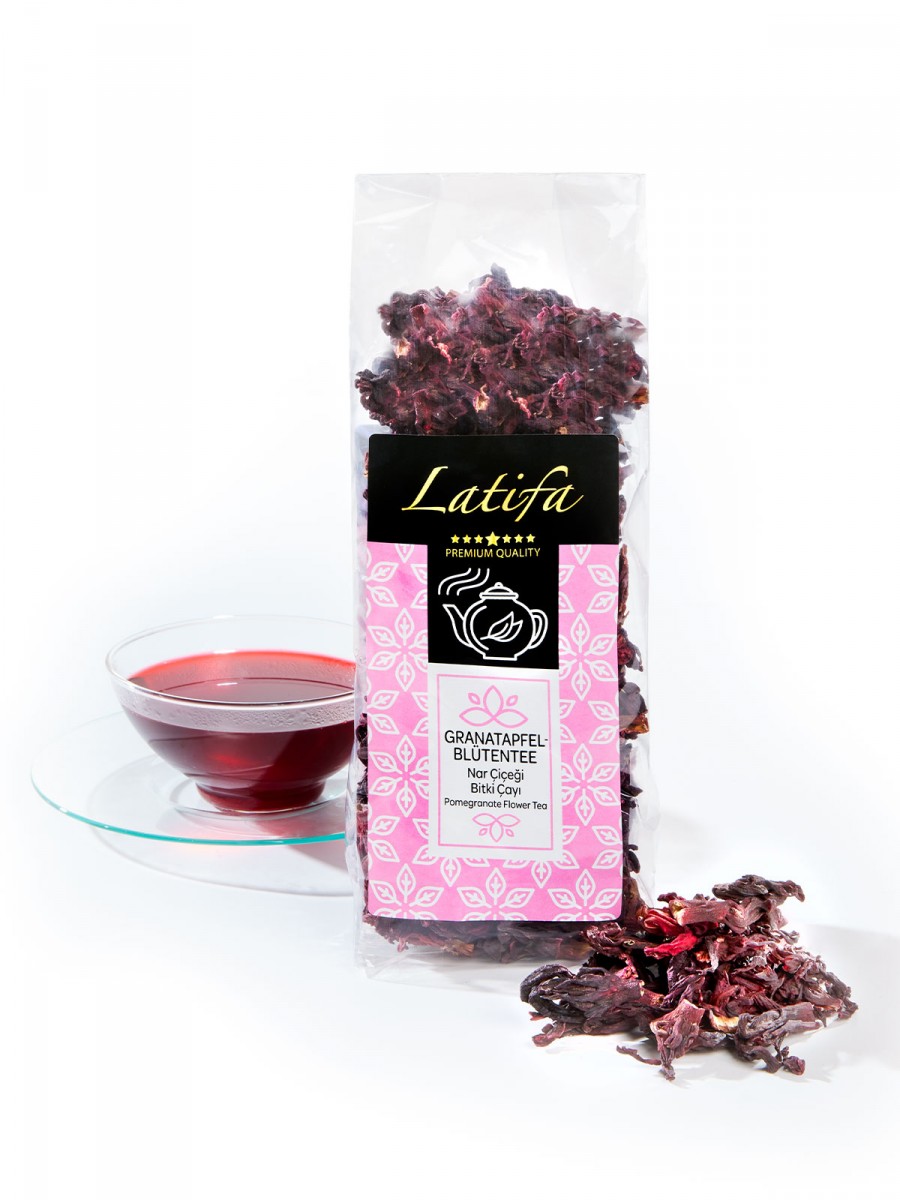Bekannt aus dem Türkei-Urlaub: Handverlesen, reich an Antioxidanten, Vitaminen und Mineralstoffen Türkischer Granatapfel-Blütentee ist etwas für Genießer, er erinnert an den Orient und die Märchen aus 1001 Nacht. Sie können damit auch wunderschöne Dekorationen für Desserts und Salate kreieren, Frischkäse und Quark zum Leuchten bringen bzw. Joghurt oder Eiscreme exotisch verfeinern. Tipp: Für einen fruchtigen Tee etwa 3 – 4 Blüten mit 100° C heißem Wasser aufgießen. Ziehzeit: 5 Minuten. 100-g-Tüte.