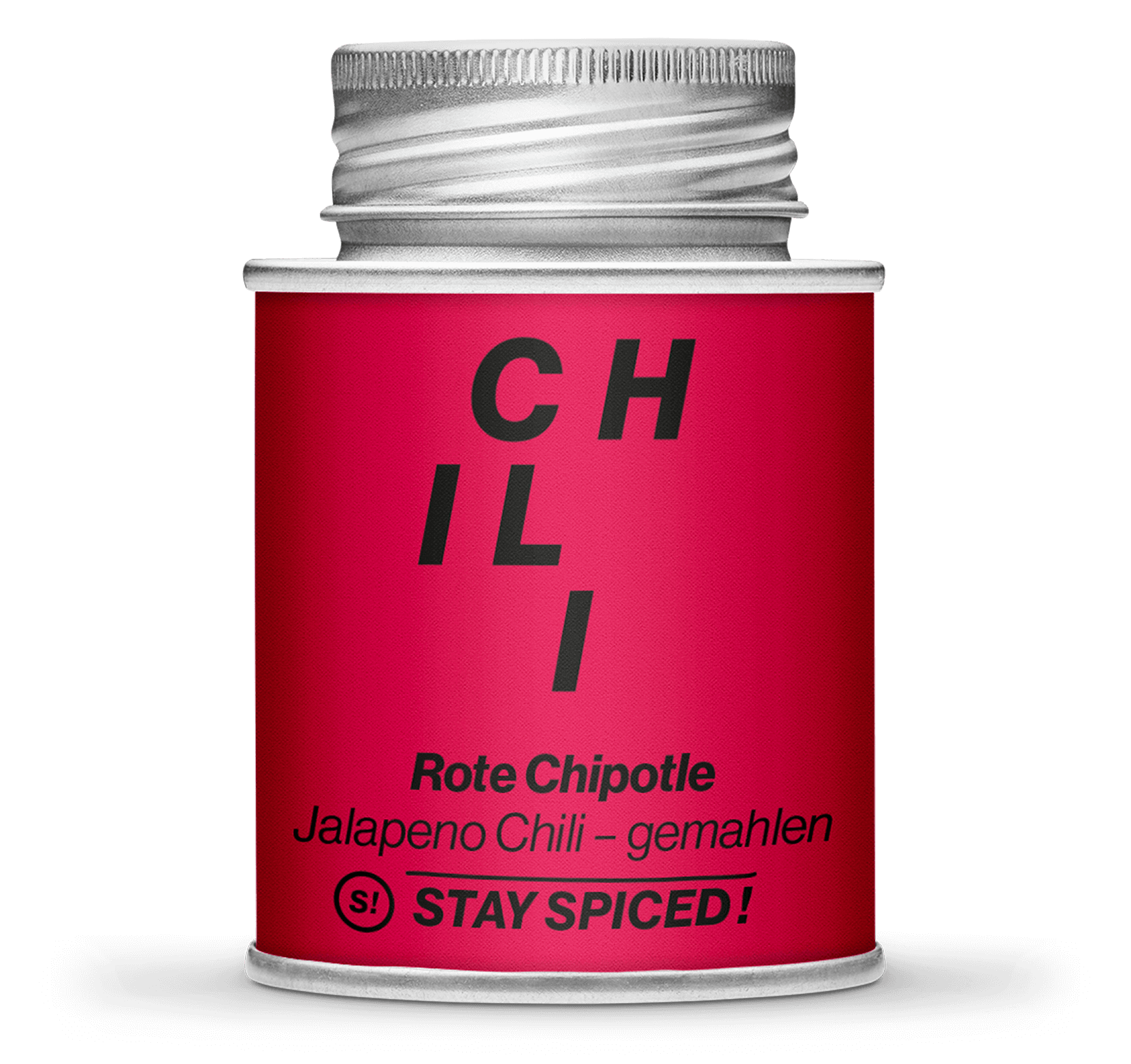 Gemahlener roter Jalapeno Chili chipotled – ein Muss für die Tex-Mex-Küche! Der rote Jalapeno Chili ist nicht nur für Chiliheads ein absoluter Genuss – er ist für all jene der perfekte Scharfmacher, die es gerne fruchtig-pikant mögen. Will man den roten Jalapeno Chili allerdings trocknen, so ist das aufgrund seiner dicken Fruchtfleischschicht eher ein schwieriges Unterfangen. Deshalb räuchert man ihn in seinem Ursprungsland Mexiko über Mesquiteholz, um ihn zu trocknen. Werden rote Jalapeno Chilis auf diese Weise getrocknet und geräuchert, so spricht man von chipotled Chilis oder Chipotles.