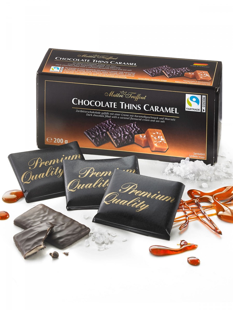 Die bringen Karamellkenner zum Schwärmen Dünne Zartbitter-Blättchen gefüllt mit einer Creme mit Karamellgeschmack und Meersalz. Fairtrade Kakao. 200 g.
