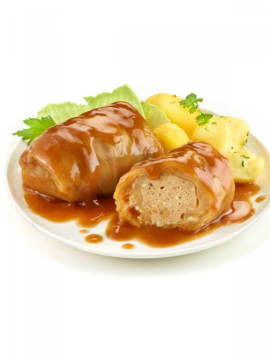 Genießen Sie die klassisch handgewickelten Krautwickel mit würziger Hackfleischfüllung 1 Kohlroulade in köstlicher pikanter Sauce. Wir empfehlen dazu Salz-Kartoffeln. 400-g-Ringpulldose.