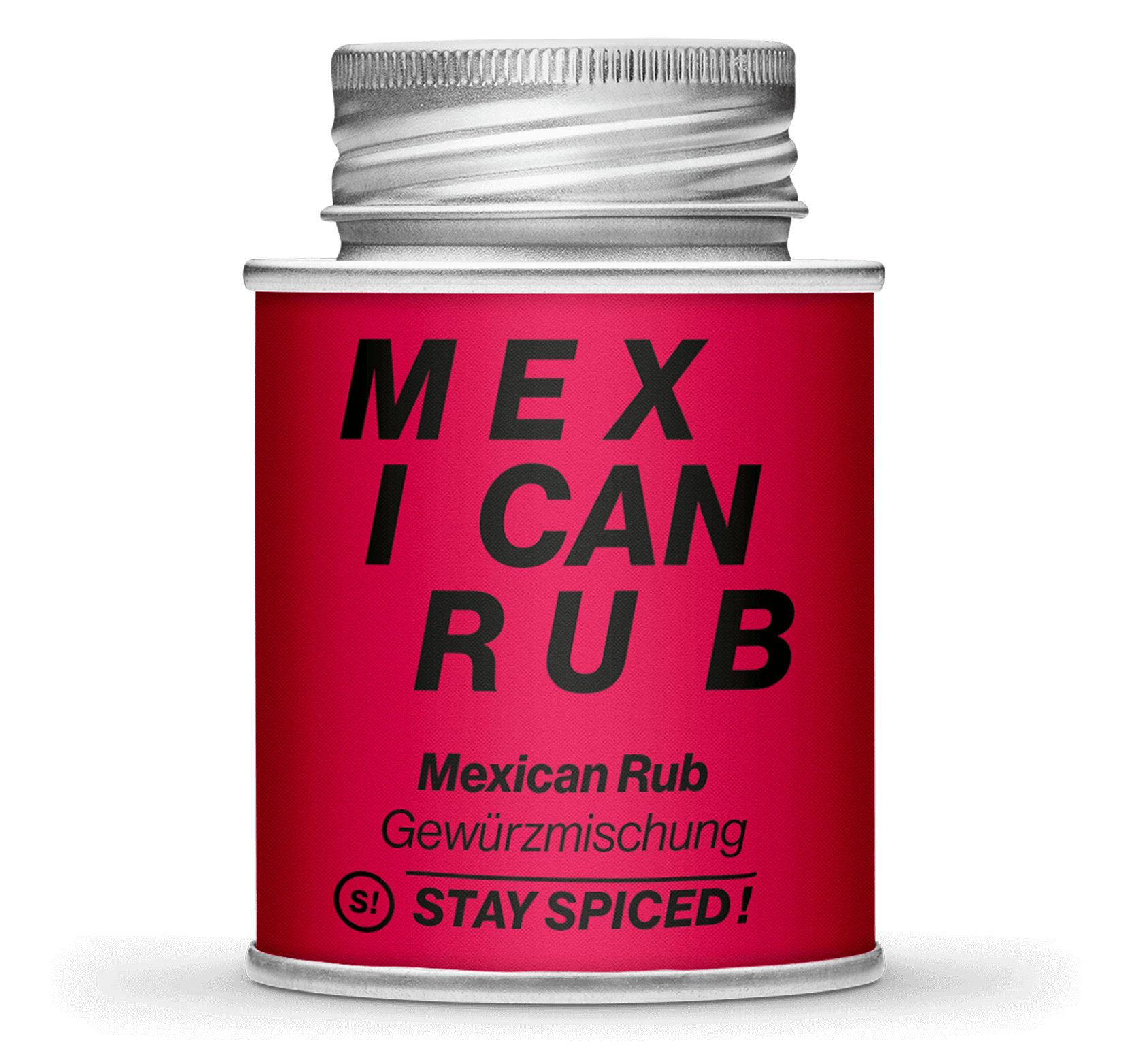 Du liebst die mexikanische Küche und Outdoor Cooking? Dann ist der S! Mexican Rub dein Gewürz! Vamonos: Auf geht’s zum mexikanischen Grillgenuss der Extraklasse – und zwar mit dem STAY SPICED ! Mexican Rub! Süßliche Zwiebeln, aromatischer Knoblauch, fruchtiges Tomatenpulver sowie Korianderblätter, Cumin, Piment und Lorbeerblätter sorgen für die würzige Basis in diesem mexikanisch angehauchten STAY SPICED ! Rub. Das Tüpfelchen auf dem Geschmacks-i geben die mexikanischen Gewürz-Klassiker Paprika und Chili, die beim Mexican Rub natürlich nicht fehlen dürfen. Und jetzt geht’s ans eingerubbte: Denn Fleischgerichte aller Art – von Barbecue Klassikern wie Spareribs, Beef Brisket und Pulled Pork bis hin zu Grillgenüssen wie Steak, Kotelett und Chicken – lassen sich mit dem Mexican Rub wunderbar würzig-mexikanisch abschmecken. S! Tipp: Der Mexican Rub schmeckt sowohl als Trockenmarinade als auch als Flüssigmarinade mit Öl ausgezeichnet. Unbedingt probieren solltest du den STAY SPICED ! Mexican Rub auch zum Verfeinern von Dips und Saucen, denen du ein bisschen mexikanische Schärfe verleihen möchtest. Köstlich picante!