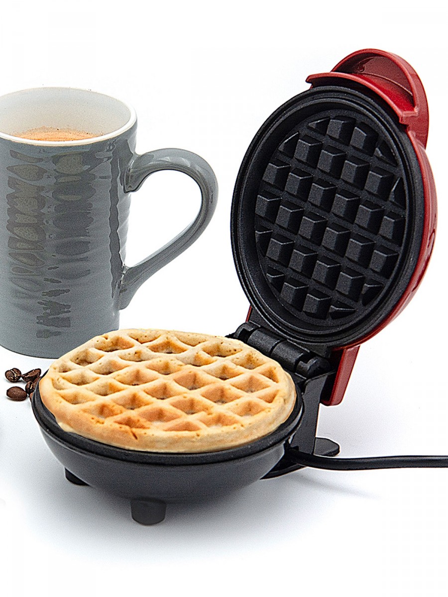 Perfekt für einzelne Waffeln, Paninis oder Rösti Gleichmäßige Bräunung ohne Anbrennen und einfacher Gebrauch dank Kontrollleuchte, Antihaftbeschichtung für leichtes und rückstandloses Ablösen und problemlose Reinigung. 220-240V, 50/60Hz, 350W. Backfläche: ca. Ø 10 cm. Ca: 12 x 12 x 9 cm. Kabellänge: ca. 75 cm. Material: Aluminium, Bakelite.