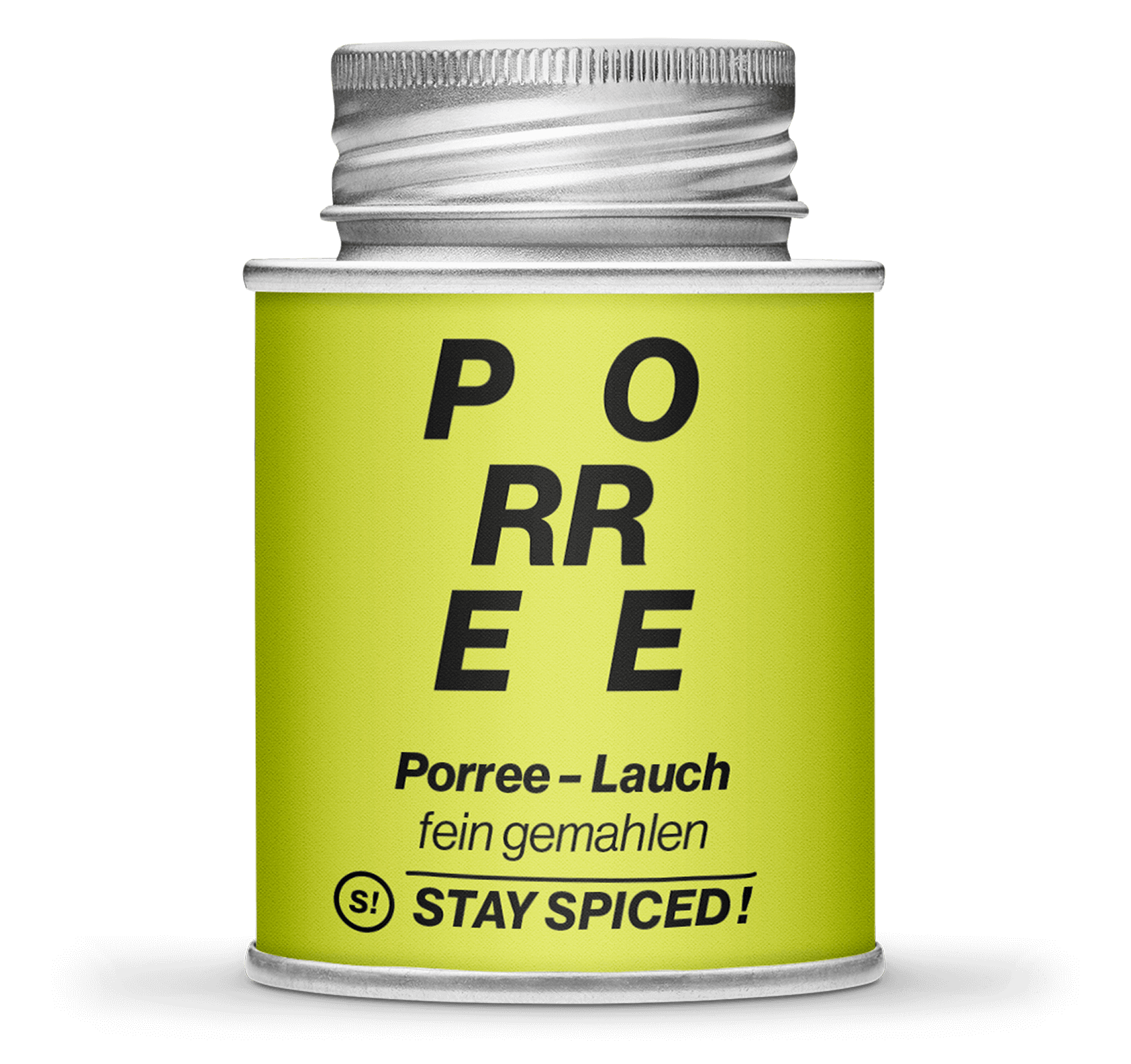 Herkunft Die Heimat des Porrees ist der Mittelmeerraum. Allgemeines Porree – oft Lauch aber auch Breitlauch, Winterlauch, Borree, Welschzwiebel, Gemeiner Lauch, Spanischer Lauch, Aschlauch, Fleischlauch genannt, ist eine aus dem Mittelmeerraum stammende Art aus der Gattung Allium in der Familie der Zwiebelgewächse (Alliaceae). Verwendung Porree wird sowohl als Gemüse (meist Winterporree) als auch als Küchengewürz (meist Sommerporree) genutzt; Man kann ihn als Gemüse oder Salat essen, oder zusammen mit Möhren und Sellerie als Gewürz in Suppen (im Suppengrün) verwenden. Spiceworld-Tipp Porree-Pulver eignet sich hervorragend für Gemüse-Saucen.