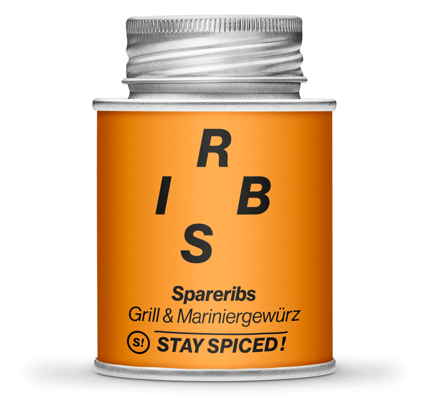 Zum Fingerabschlecken gut: Das Spareribs Grill- & Marinadengewürz von STAY SPICED ! Richtig zubereitet gehören Spareribs zu den wohl zartesten Stücken des Schweins. Und der Outdoor Cooking Leckerbissen zählt neben Beef Brisket und Pulled Pork als drittes Must-have zur legendären „holy trinity“, der „heiligen Dreifaltigkeit“ des BBQ. Umso wichtiger ist die richtige Würzung für der begehrten Barbecue Spareribs – und das findest du genau hier! Das STAY SPICED ! Spareribs Grill & Marinadengewürz unterstreicht mit seiner typischen süß-rauchigen Note den vollen Geschmack des feinen Rippchenfleisches. Neben geräuchertem Salz und unbehandeltem Meersalz sind Pfeffer, edelsüßer Paprika, Knoblauch, Kümmel, Koriander, Zwiebel und Chili die geschmacksentscheidenden Zutaten dieser reichhaltigen Gewürz-Komposition. Basilikum, Karotten, Pastinaken, Kurkuma, Lauch, Sellerie und Petersilie runden das Geschmackserlebnis ab. S! Tipp: Bevor du den Rippchen mit dem STAY SPICED ! Spareribs Grill & Marinadengewürz eine ordentliche Rub Abreibung verpasst, solltest du unbedingt die Silberhaut vom Fleisch entfernen. Wenn du die Spareribs am BBQ Smoker zubereitest, verwende die Gewürzmischung als Trocken-Rub – also ohne Öl – da sonst der Rauch nicht durch das Öl dringen kann. Pack die gewürzten Spareribs in Alufolie und smoke sie für 3 Stunden bei 110 Grad, anschließend für 2 Stunden über einem Wasserbad. Die letzten 2 bis 3 Stunden mehrmals glasieren.