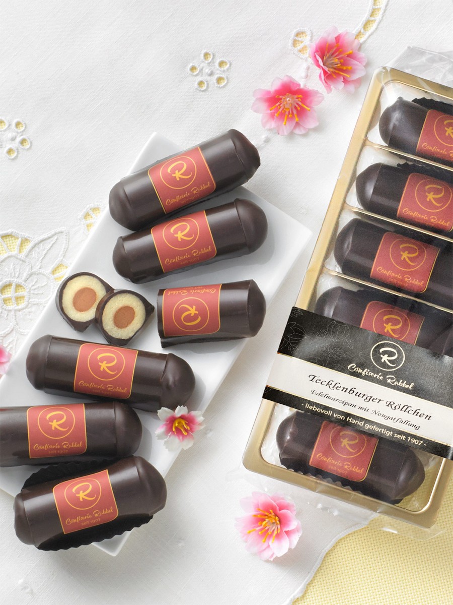 Marzipan-Röllchen, gefüllt mit feinstem Haselnussnougat, überzogen mit Edelbitter-Schokolade. Die Tecklenburger Röllchen wurden von dem Konditormeister Norbert Rabbel in den frühen 70iger Jahren in der kleinen Werkstatt Tecklenburg erfunden. Für diese regionale Spezialität kam nur feinste Marzipan-Rohmasse (höherer Marzipananteil als bei Edelmarzipan) und der beste Haselnussnougat aus türkischen Haselnüssen zur Verwendung. Überzogen wird diese Spezialität von belgischer Edelzartbitter-Kuvertüre mit hohem Kakaoanteil. 150 g.