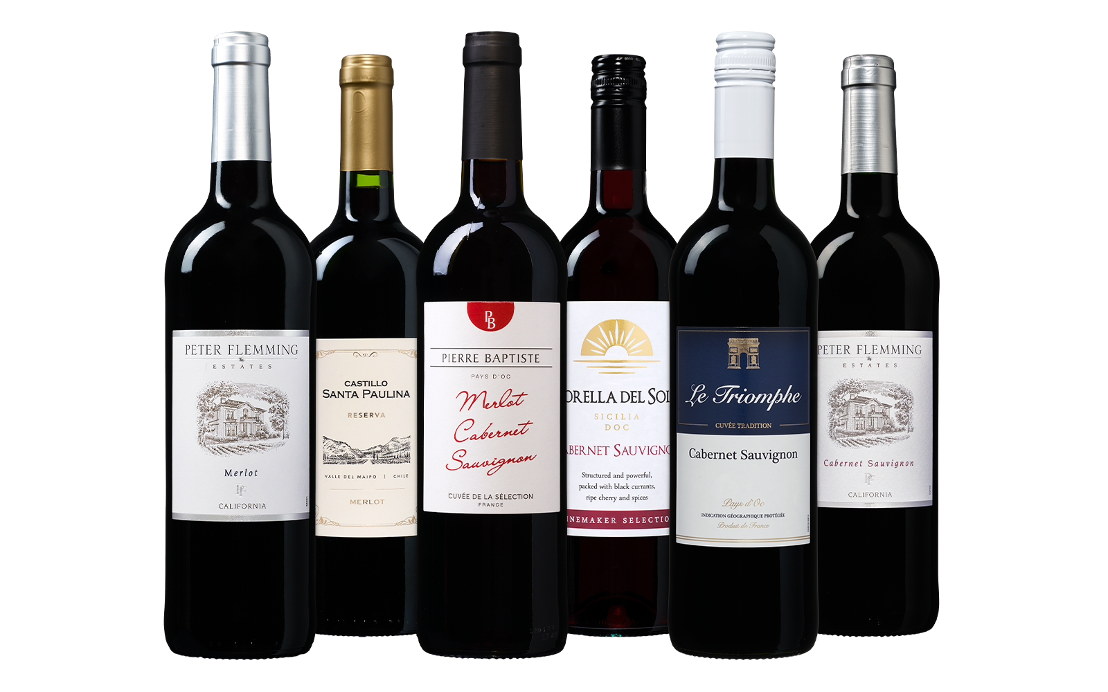 Das Schönste aus zwei Welten. Die beiden Traubensorten ergeben stets von neuem herrliche Genussmomente. Ganz gleich wo auf der Welt sie reifen, am Ende wird ein himmlischer Wein daraus. Aus Frankreich können wir von Le Triomphe eine betörenden kräftigen Cabernet Sauvignon anbieten. Pierre Baptiste sah in beiden Trauben die perfekte Yin-und-Yang-Kombination und entschied sich für einen Cuvée. Aus Chile bekommen Sie einen Merlot, und Peter Flemming aus den USA überrascht Sie mit einem Cabernet Sauvignon. Wir stoßen an auf die beiden Supertrauben!