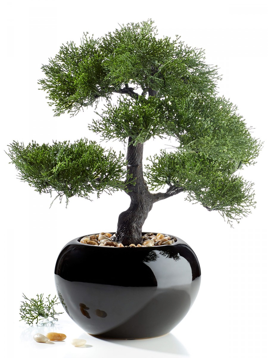 Holen Sie sich mit diesem schönen Zypressen-Bonsai die fernöstliche Kunst der „kleinen Bäume“ nach Hause, jedoch ohne den langwierigen Pflegeprozess. Dieser eindrucksvolle Bonsai ist nicht nur äußerst dekorativ, er verkörpert auch die Philosophie des Zen und verspricht große innere Ruhe und Harmonie. Aus absolut hochwertigen Kunstmaterialien gefertigt, lässt er sich von den echten Bäumen kaum unterscheiden. Der schwarze Keramiktopf sowie der Kies sind im Lieferumfang enthalten. Mit Tischschonerfüßchen. Maße: Ø Topf: ca. 18 cm, Höhe: ca. 34 cm.